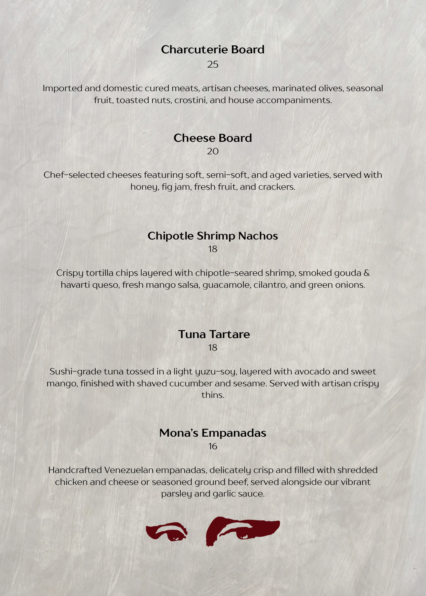Our menu is designed for sharing, featuring thoughtfully prepared small plates that balance bold flavors, quality ingredients, and refined presentation. From artisanal boards to elevated classics, each dish is created to complement the experience and bring people together.